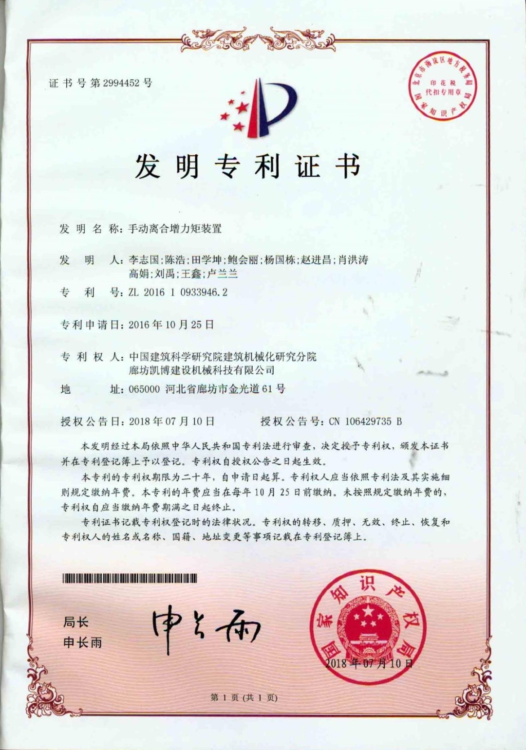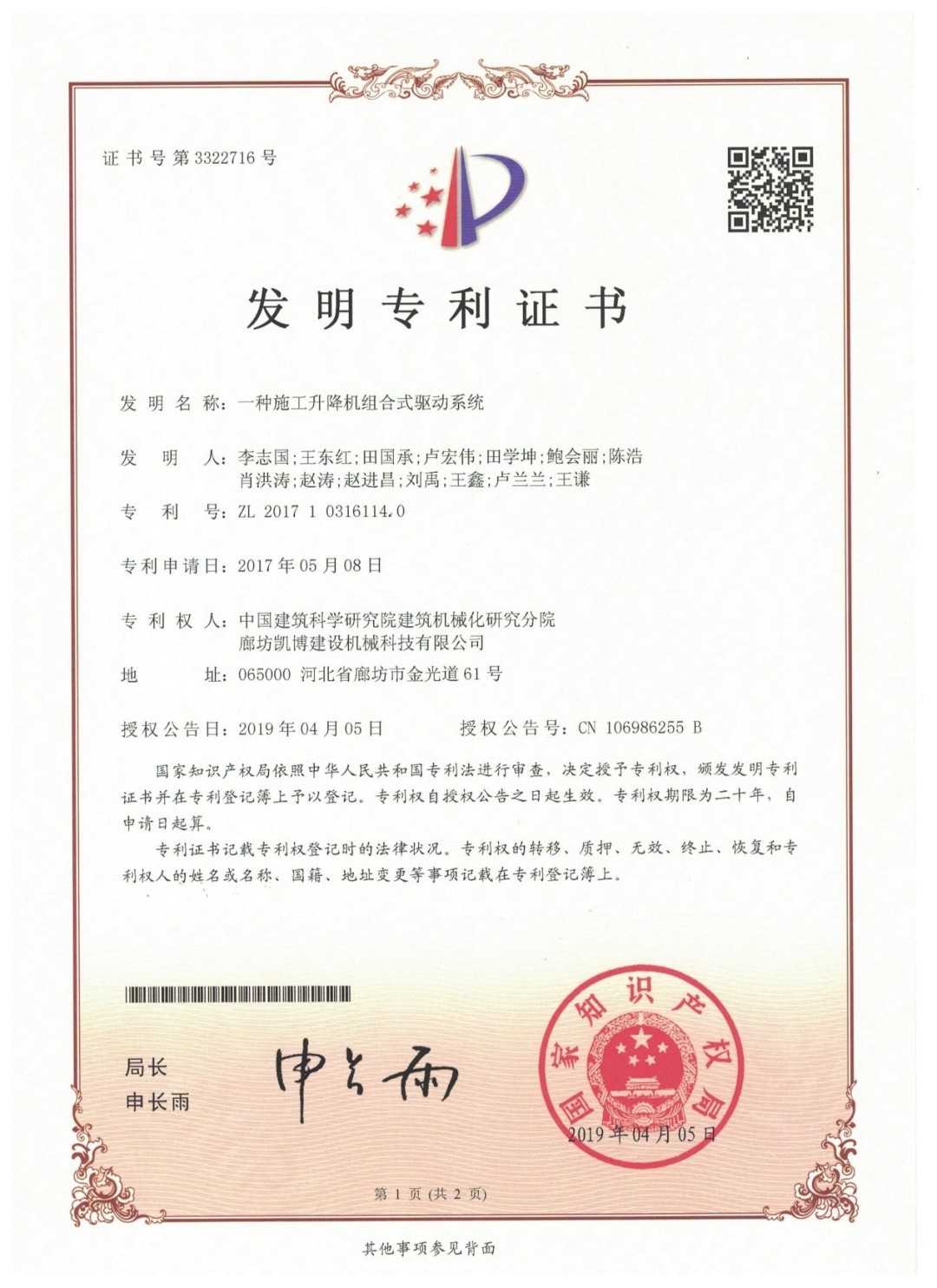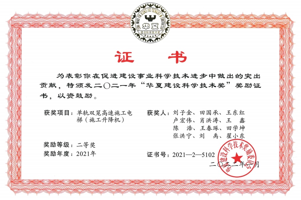 ? ? ? ? ? 本產(chǎn)品獲2項(xiàng)發(fā)明專利——施工升降機(jī)組合式驅(qū)動(dòng)系統(tǒng)(專利編號(hào):ZL201710316114.0)和手動(dòng)離合增力矩裝置(專利編號(hào):ZL201610933946.2);主編參編GB/T37537-2019《施工升降機(jī)安全監(jiān)控系統(tǒng)》、GB/T 26557《吊籠有垂直導(dǎo)向的人貨兩用施工升降機(jī)》兩項(xiàng)國(guó)家標(biāo)準(zhǔn);2021年榮獲“華夏建設(shè)科學(xué)技術(shù)獎(jiǎng)”二等獎(jiǎng)。為解決我國(guó)超高層建筑人員物料垂直運(yùn)輸?shù)母咝О踩椒€(wěn)運(yùn)行難題提供了強(qiáng)有力的技術(shù)支撐。